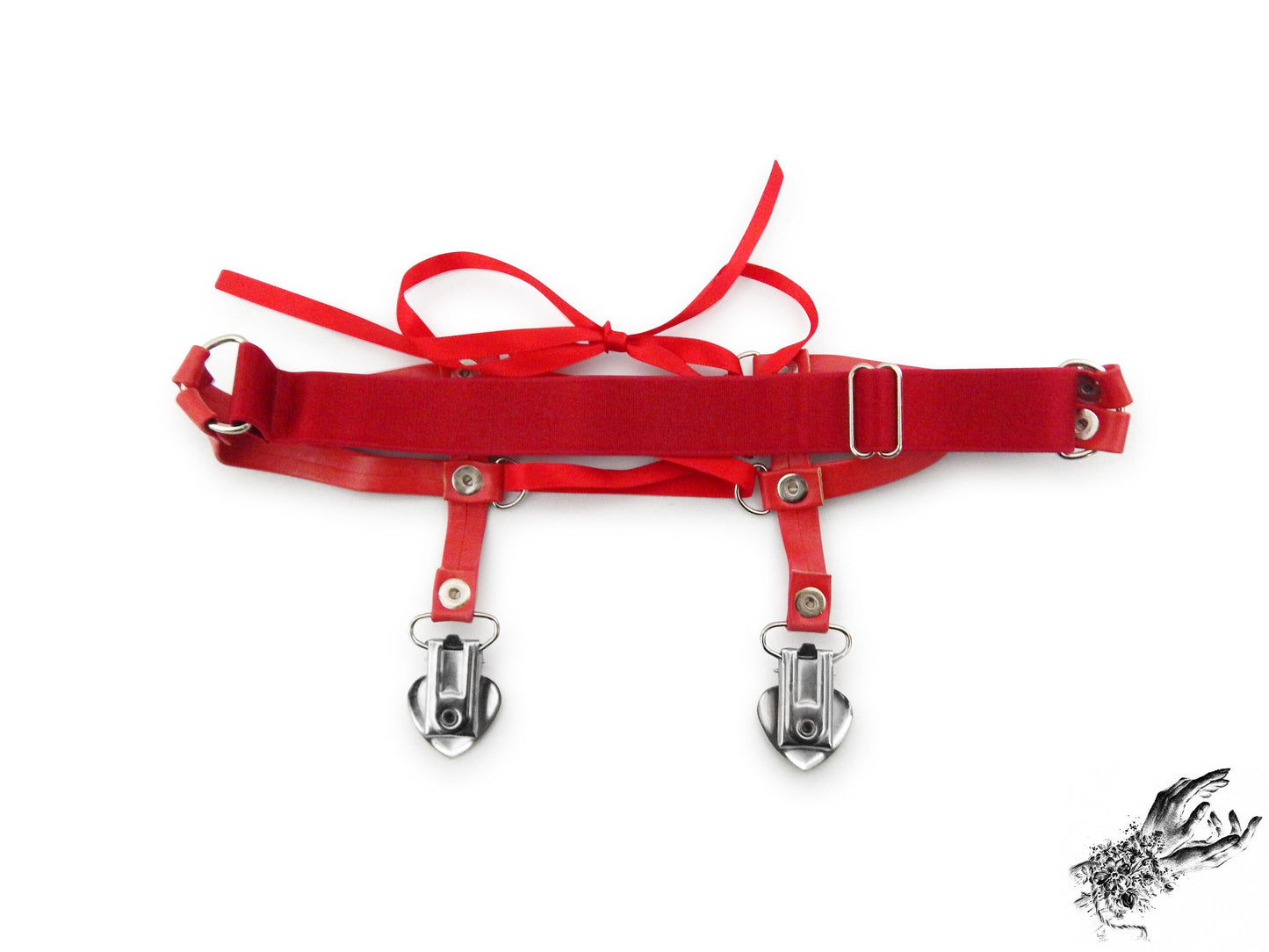 This is a red leather garter featuring a red ribbon corset lacing design with cute heart shaped metal suspender clips to hold your socks or stockings up. This red corset garter makes an alternative gift for gothic, metal, egirl, kawaii, Harajuku and other alternative fashions. These heart ring garters are perfect for keeping your knee high socks or thigh high socks up, but are also a great fashion statement on their own.